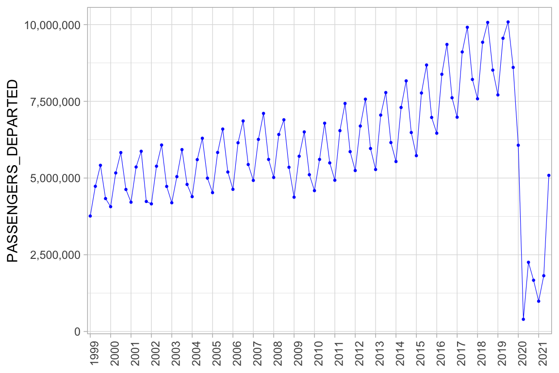 ggplot(aes(x = PERIOD, y = PASSENGERS_DEPARTED)) +