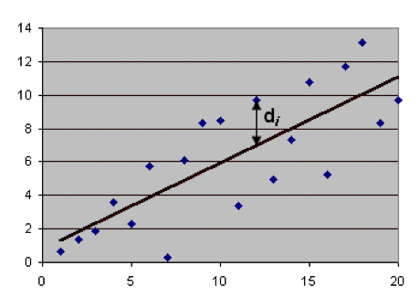 Figuur 8. De regressielijn is de lijn waarvoor de som van de kwadraten van de di’s minimaal is.